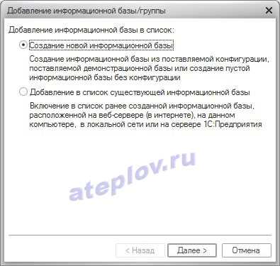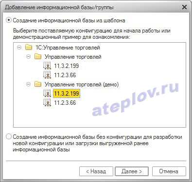 Выбираем пункт создание базы из шаблона. Я для примера выбрал Управление торговлей 11.3 демо: