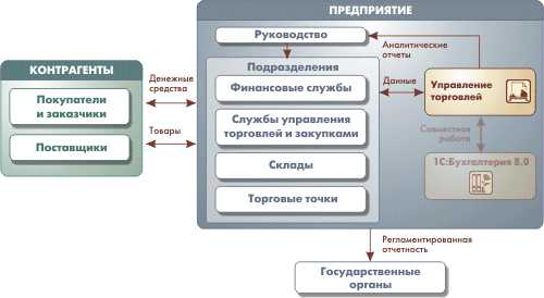 Предметная область, автоматизируемая прикладным решением «1С:Управление торговлей 8», может быть представлена в виде следующей схемы.