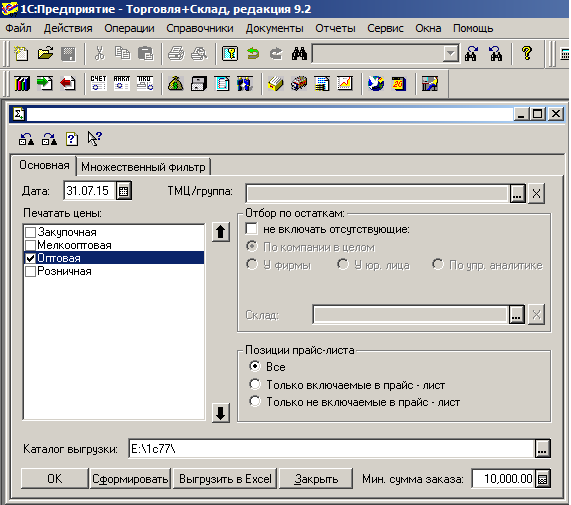 Данный документ можно отметить избранным, для быстрого доступа. В поле «Прайс-лист на» автоматически проставляется действующая дата. Здесь имеется небольшой набор функций: изменить цены, распечатать, выгрузить или загрузить в Excel™. При нажатии на клавишу «Сформировать» появляется окно настройки параметров прайс-листа: