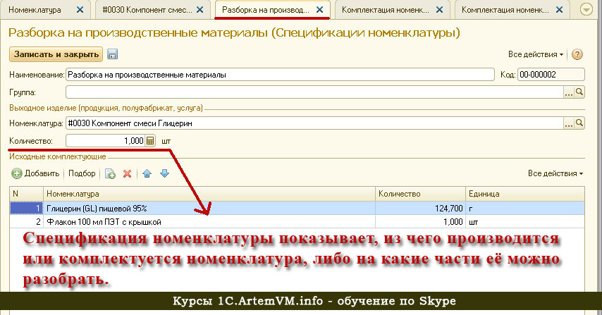 Как видите, в спецификации указано, что получается из одной единицы «разбираемой» номенклатуры (банки с глицерином).