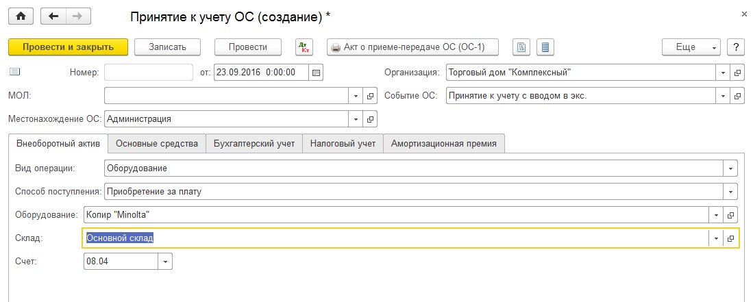 На основании документа поступления, создаем «Принятие к учету ОС». Как правило, принимаем к учету ОС день в день, либо днем позже. Обращайте внимание на время приема.