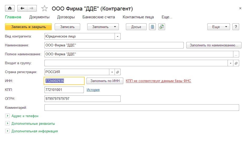 Перейдем к созданию контрагента. Для заполнения данных в карточке контрагента существует сервис 1С:Контрагент, который поможет заполнять все данные по ИНН. Данные подтягиваются из ЕГРЮЛ и ЕГРИП. Использование 1С:Контрагент облегчит работу бухгалтера и позволит избежать ошибок при вводе.