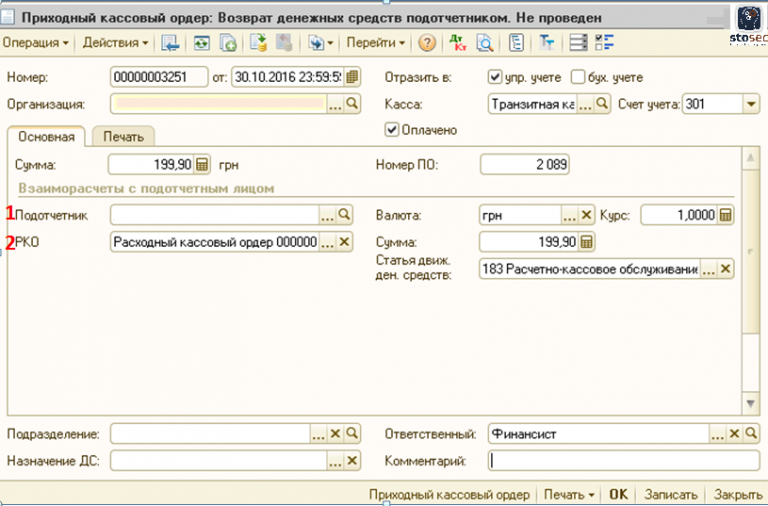 - Подотчетное лицо – вводим данные, от кого принимаем возврат денежных средств;