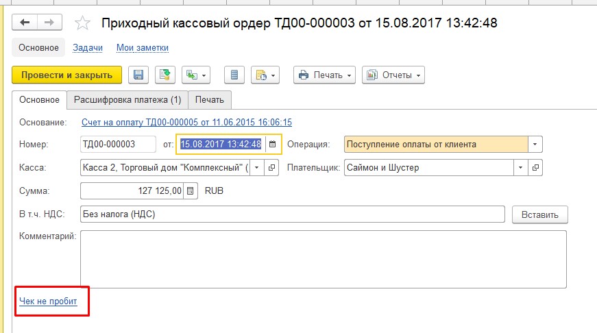 Если подключен фискальный регистратор, то через кнопку «Напечатать чек», которая находится на верхней панели, можно распечатать чек. Обратите внимание, что в ПКО можно добавить неограниченное количество строк. Сделано это для того, чтобы можно было разделить оплату либо по договорам, либо по статьям движения средств. Для примера добавим еще одну строку, разделим сумму поступления и укажем статью ДДС – «Прочие поступления».