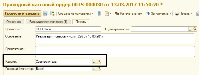 Данный вид заполняется аналогично, только указываем не контрагента, а физическое лицо. Прописываем сумму. Проводим, заполняем если нужно настройки печатной формы. Печатаем, отдаем на подпись. В проводке будет отображаться Дт50.01 — Кт73.01 – поступление от погашения займов.