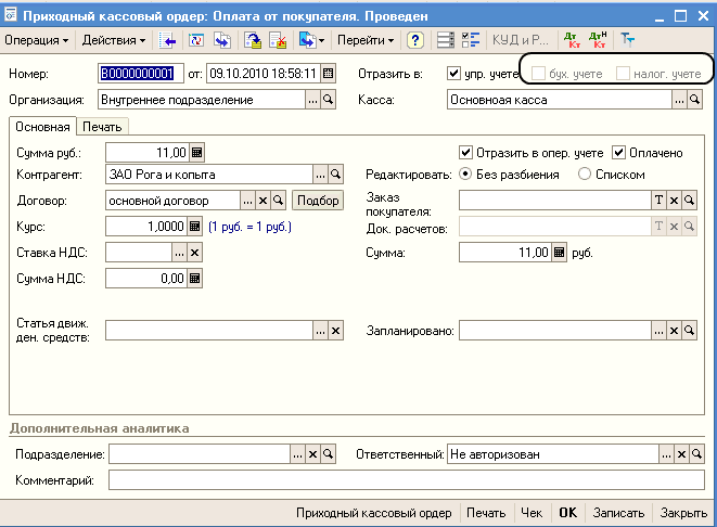 Теперь посмотрим заполнение приходного ордера по каждому виду подробно.