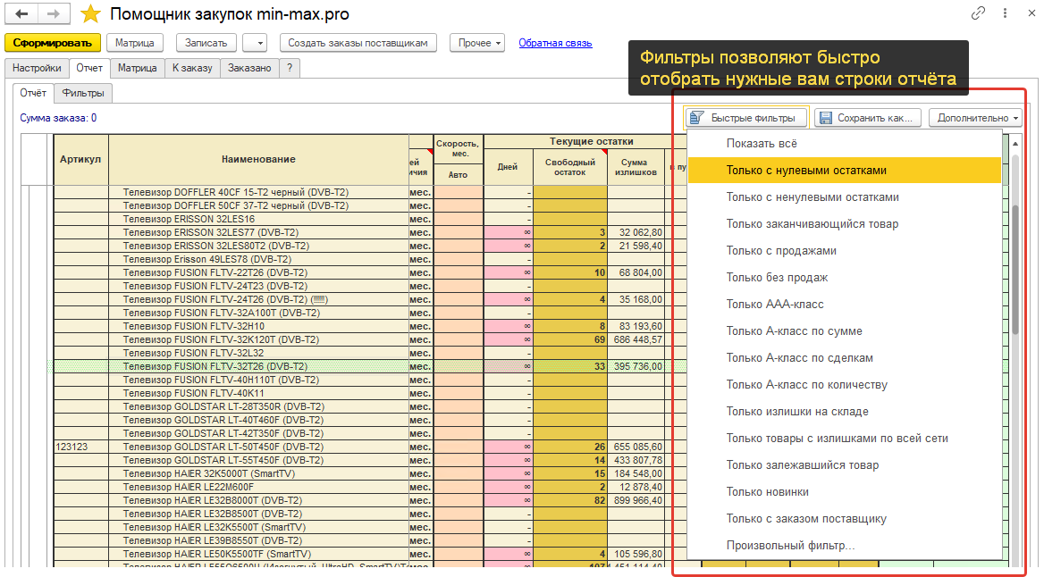 - расширенный типовой пакет отчетов для анализа эффективности закупочной деятельности;
