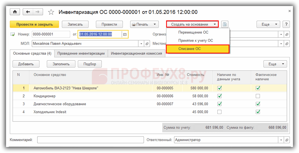 таблицу примера) — необходимо создать документ Списание ОС. В результате проведения документа будут сформированы соответствующие проводки.