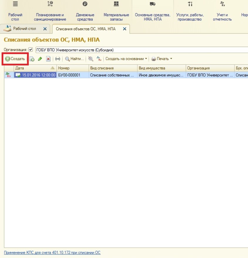 - Вызов из меню: ОС и НМА — Выбытие основных средств — Списание ОС.