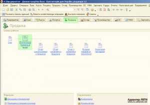 Для этого нужно зайти в пункт главного меню «Продажа» и выбрать пункт «Реализация товаров и услуг». Откроется одноименный журнал. К точно такому же результату можно прийти выбрав закладку «Продажа» панели функций и нажав кнопку «Реализация товаров и услуг».