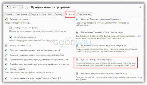 В открывшейся форме перейдите на вкладку «Торговля» и проверьте, установлена ли «галочка» на пункте «Доставка товара автотранспортом». В противном случае — установите.