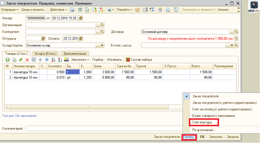 Заказ покупателя (клиента) в 1С Управление торговлей / ТСЦ ПОРТ / Красноярск