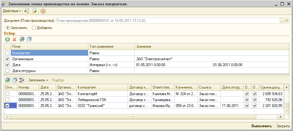 - ставим галочку «Заказ», вид сравнения: равно (или в списке, если формируем заказ по нескольким заказам на внутреннее потребление), значение: выбираем заказ на внутреннее потребление.