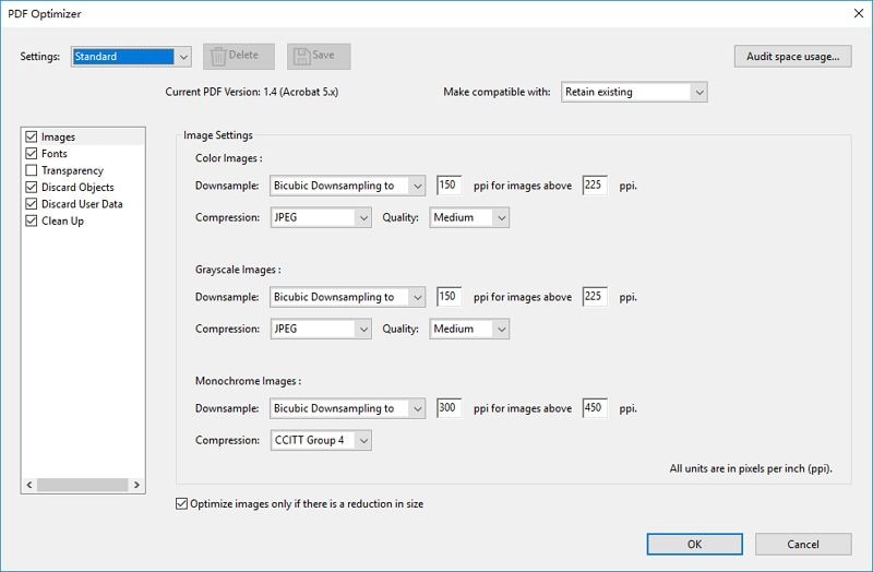 Это легко сделать, перейдя в тот же пункт меню в «Файл», «Сохранить как другое». Вместо выбора «Уменьшить размер PDF» выберите «Оптимизированный PDF». Найдите кнопку «Настройки» и нажмите ее. Выберите Пользовательские настройки. Обязательно выберите 75 пикселей на дюйм при оптимизации, чтобы уменьшить как цветные изображения, так и изображения в оттенках серого. Сохраните файл и проверьте размер файла, чтобы убедиться, что он соответствует вашим потребностям.