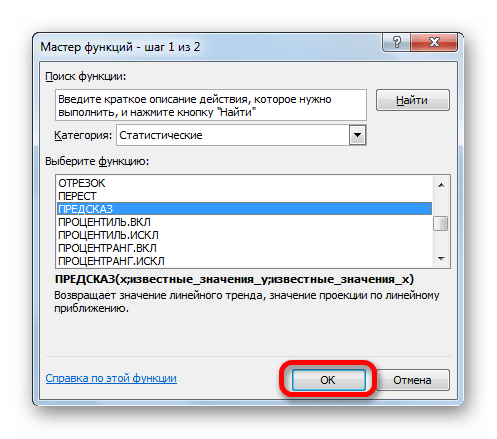 - Запускается окно Мастера функций. Выполняем переход в категорию «Статистические» или «Полный алфавитный перечень». В открывшемся списке производим поиск наименования «ПРЕДСКАЗ». Найдя его, выделяем, а затем щелкаем по кнопке «OK» в нижней части окна.