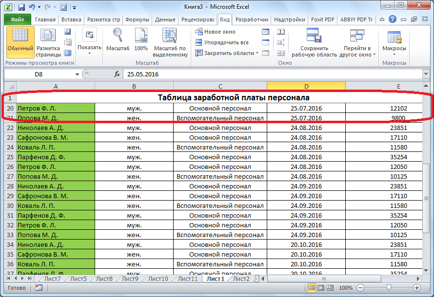- Закрепленная строка остается на месте при прокрутке листа вверх или вниз