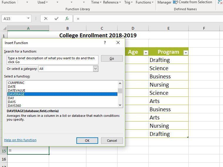 - Введите знак равенства (=) и нужное имя функции. Вы также можете вставить функцию из списка, который появится при вводе ее названия (автозавершение в Excel). В нашем случае мы введем =СРЗНАЧ.