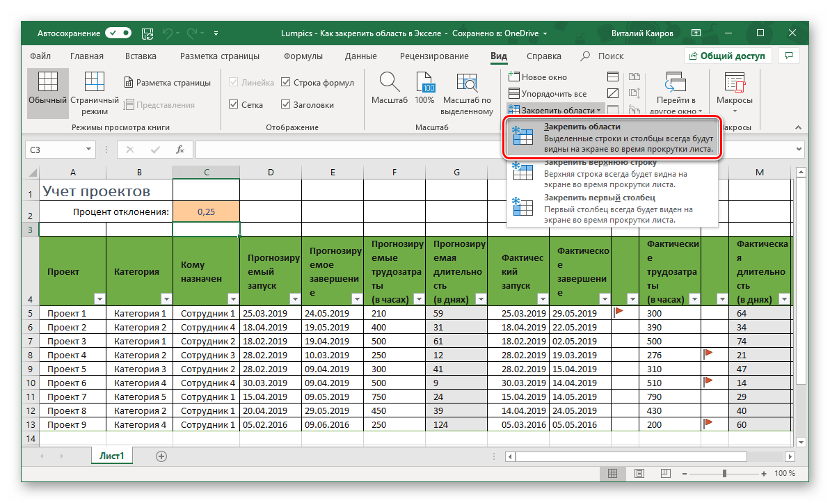 После того, как вы отметили выбранную ячейку, щелкните вкладку «Просмотр», затем перейдите в раздел «Окно» и выберите «Закрепить области». Если вы хотите закрепить только верхнюю строку или только левый столбец, выберите один из других вариантов — «Закрепить верхнюю строку» или «Закрепить первый столбец».