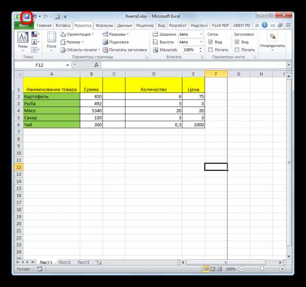 Закладка листа Excel «Разметка страницы».
