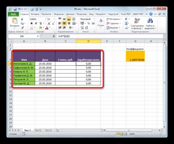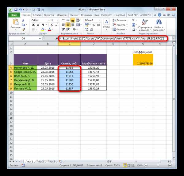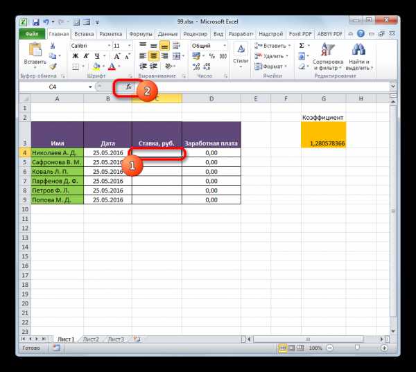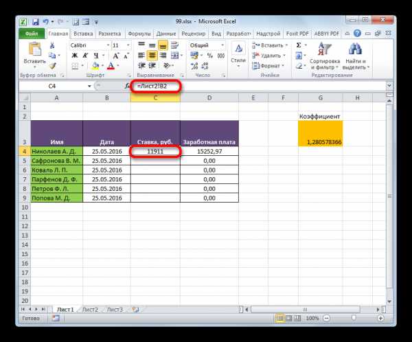 Посмотрим, как на примере можно образовать связь путем прямого связывания. Имеем две таблицы на двух листах. На одной таблице производится расчет заработной платы с помощью формулы путем умножения ставки работников на единый для всех коэффициент.