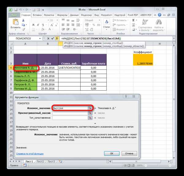 Листе 1, в которых расположены имена сотрудников.«Просматриваемый массив» — аргумент, представляющий собой ссылку на массив, в котором выполняется поиск указанного значения для определения его позиции. У нас эту роль будет исполнять адрес столбца «Имя» на Листе 2.