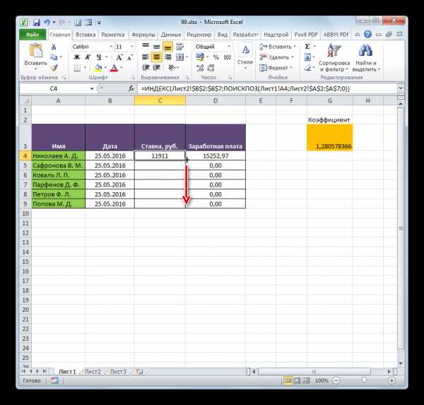 =ИНДЕКС(Лист2!$B$2:$B$7;ПОИСКПОЗ(Лист1!A4;Лист2!$A$2:$A$7;0)) - Теперь можно произвести копирование с помощью маркера заполнения. Вызываем его тем же способом, о котором мы говорили ранее, и протягиваем до конца табличного диапазона.