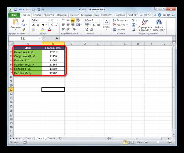 На втором листе расположен табличный диапазон, в котором находится перечень сотрудников с их окладами. Список сотрудников в обоих случаях представлен в одном порядке.