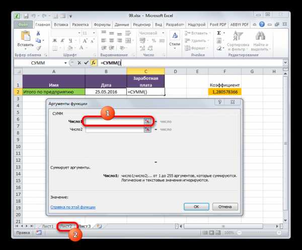 =СУММ(число1;число2;…)Поля в окне соответствуют аргументам указанной функции. Хотя их число может достигать 255 штук, но для нашей цели достаточно будет всего одного. Ставим курсор в поле «Число1». Кликаем по ярлыку «Лист 2» над строкой состояния.