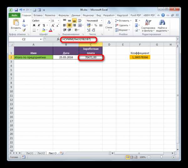 Посмотрим, как это осуществляется на практике. Сделаем так, что на Листе 3 будут выводиться общие данные заработной платы по предприятию без разбивки по сотрудникам. Для этого ставки сотрудников будут подтягиваться из Листа 2, суммироваться (при помощи функции СУММ) и умножаться на коэффициент с помощью формулы.