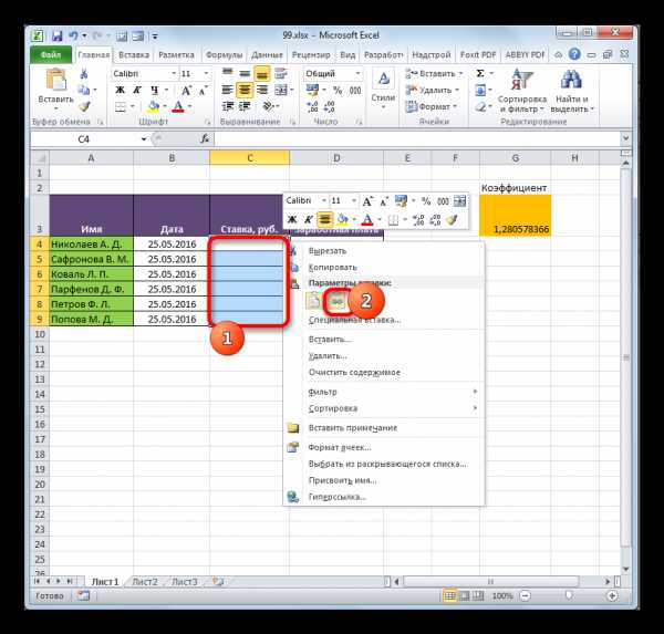 - Выделяем значения, которые нужно будет «затянуть» в другую таблицу. В нашем случае это диапазон столбца «Ставка» на Листе 2. Кликаем по выделенному фрагменту правой кнопкой мыши. В открывшемся списке выбираем пункт «Копировать». Альтернативной комбинацией является сочетание клавиш Ctrl+C. После этого перемещаемся на Лист 1.