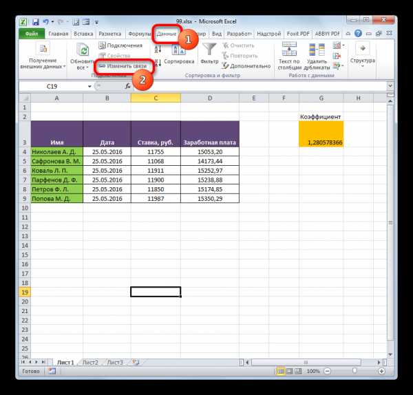 - В книге, в которой подтягиваются значения из других файлов, переходим во вкладку «Данные». Щелкаем по значку «Изменить связи», который расположен на ленте в блоке инструментов «Подключения». Нужно отметить, что если текущая книга не содержит связей с другими файлами, то эта кнопка является неактивной.