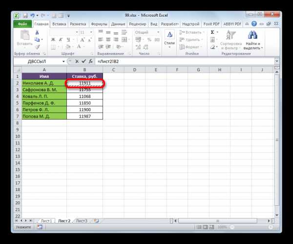 - Затем происходит автоматический переход на первый лист. Как видим, в соответствующую ячейку подтягивается величина ставки первого сотрудника из второй таблицы. Установив курсор на ячейку, содержащую ставку, видим, что для вывода данных на экран применяется обычная формула. Но перед координатами ячейки, откуда выводятся данные, стоит выражение «Лист2!», которое указывает наименование области документа, где они расположены. Общая формула в нашем случае выглядит так: