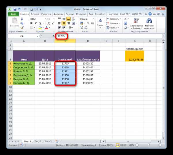 - Но это ещё не все. Как мы помним, зарплата вычисляется путем умножения величины ставки на коэффициент. Поэтому снова выделяем ячейку, в которой находится суммированная величина. После этого переходим к строке формул. Дописываем к имеющейся в ней формуле знак умножения (*), а затем щелкаем по элементу, в котором располагается показатель коэффициента. Для выполнения вычисления щелкаем по клавише Enter на клавиатуре. Как видим, программа рассчитала общую заработную плату по предприятию.