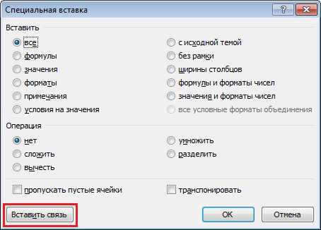 - После этого открывается окно специальной вставки. Жмем на кнопку «Вставить связь» в нижнем левом углу ячейки.