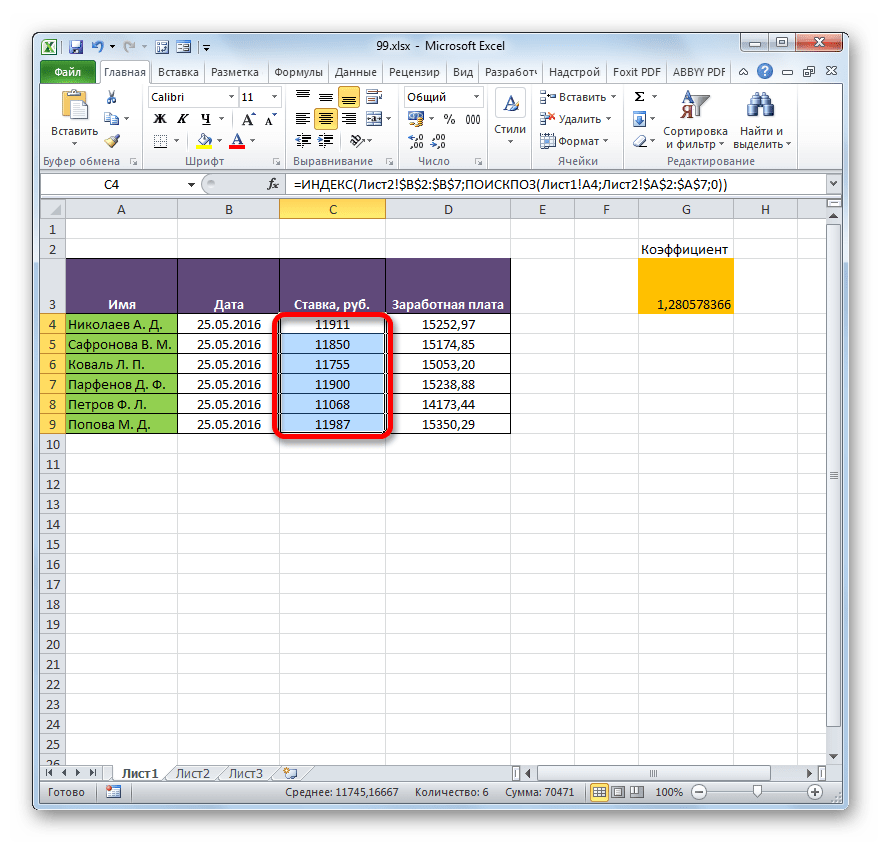 - Как видим, несмотря на то, что порядок строк у двух связанных таблиц не совпадает, тем не менее, все значения подтягиваются соответственно фамилиям работников. Этого удалось достичь благодаря применению сочетания операторов ИНДЕКС—ПОИСКПОЗ.