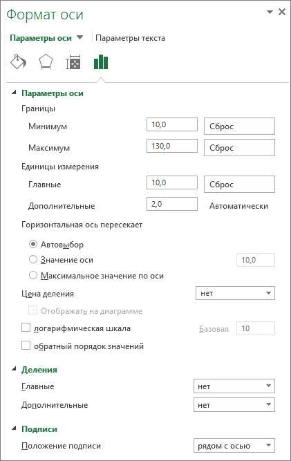 ось значений.Подписи осейЦена основных деленийПримечание.Чтобы применить к оси