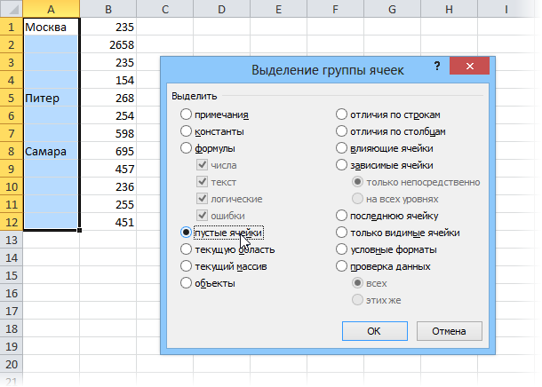Появится множество доступных вариантов условного выделения, зависимо от содержимого ячеек. Это могут быть примечания, формулы, константы, формулы с ошибками, пустые клетки, зависимые, влияющие, последние ячейки. Дополнительно к этому можно отметить все элементы, которые не находятся внутри клеток. Это могут быть различные рисунки, диаграммы, геометрические фигуры, схемы.