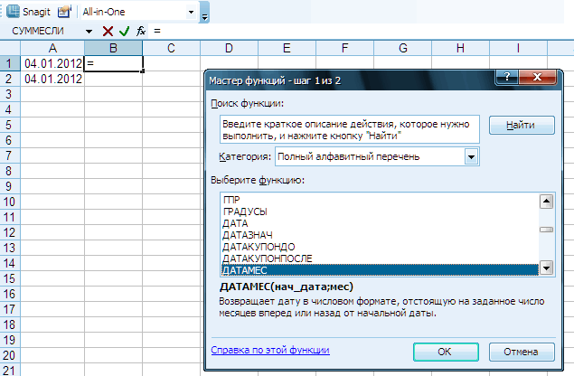 В этом окне нужно выбрать категорию функции и в списке ниже необходимую функцию.