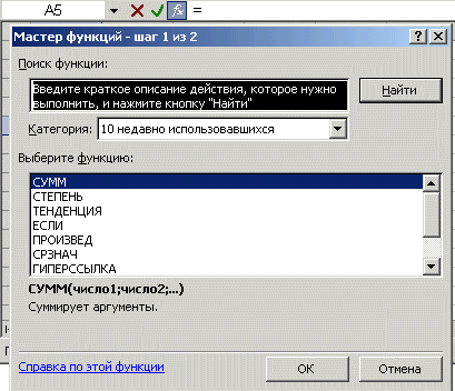 После вызова Мастера функций появляется диалоговое окно (Рис.3):