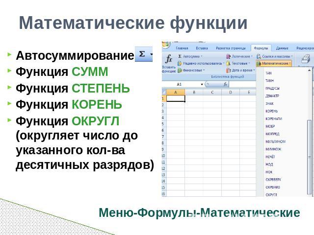 В программе Excel разработчиками заложено огромное количество различных функций, но, пользователи чаще всего пользуются математическими. Давайте рассмотрим их и подробнее остановимся на самых популярных.