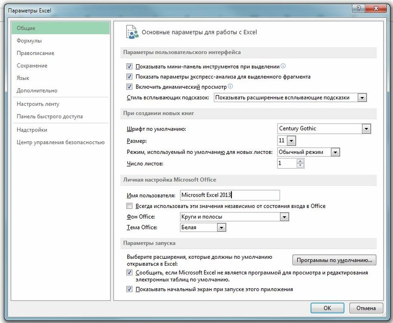 Очень полезная функция, предваряющая любые изменения, если они нанесут вред или дадут ненужный результат. - Также во вкладке основных параметров необходимо настроить количество листов во вновь создаваемой книге, шрифт, используемый по умолчанию, его размер и режим чтения.