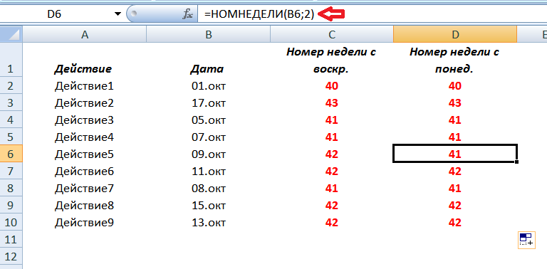 =НОМЕР НЕДЕЛИ(A2) | Номер недели в году, на которую приходится 09. | 10 |