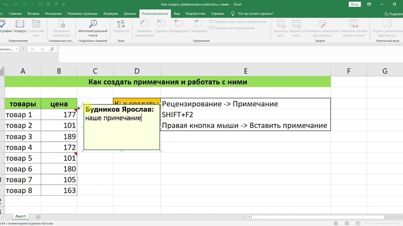 Вставитьсоздать Примечание кнопкой мыши ячейку