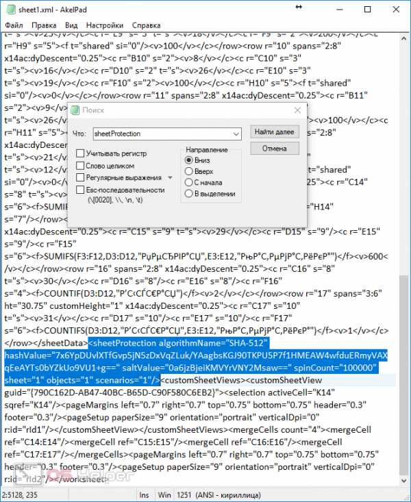 - Нажмите на сочетание клавиш Ctrl+F. Введите там слово «sheetProtection». Затем на кнопку «Найти далее».