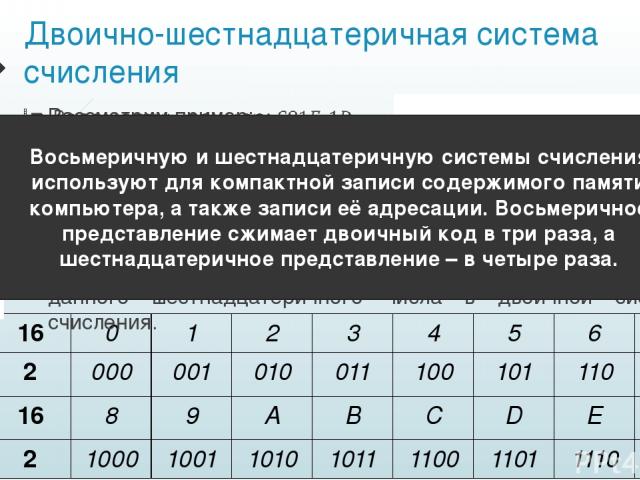 В системе счисления с основанием 16 используется 16 символов. Это 10 десятичных цифр (0, 1, 2, 3, 4, 5, 6, 7, 8, 9).) и первые шесть букв английского алфавита (A, B, C, D, E, F). Буквы используются из-за необходимости представлять значения 10, 11, 12, 13, 14 и 15 каждое в одном единственном символе.Hex используется в математике и информационных технологиях как более удобный способ представления двоичных чисел. Каждая шестнадцатеричная цифра представляет четыре двоичных цифры; следовательно, hex — это язык для записи двоичного кода в сокращенной форме.