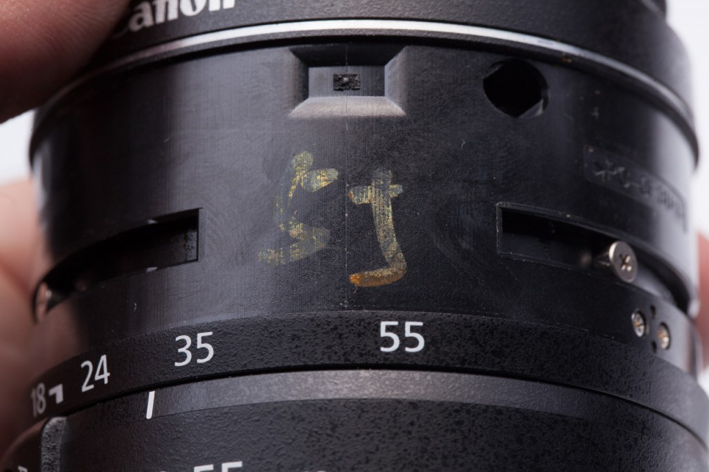 Шкала диафрагмы/фокусного расстояния для Canon EF-S 18–55 мм F/3,5–5,6 IS . Этот объектив неправильно считывает метки среднего фокусного расстояния в данных EXIF; отметка 24 мм означает 23 мм, 35 мм означает 34 мм и т.