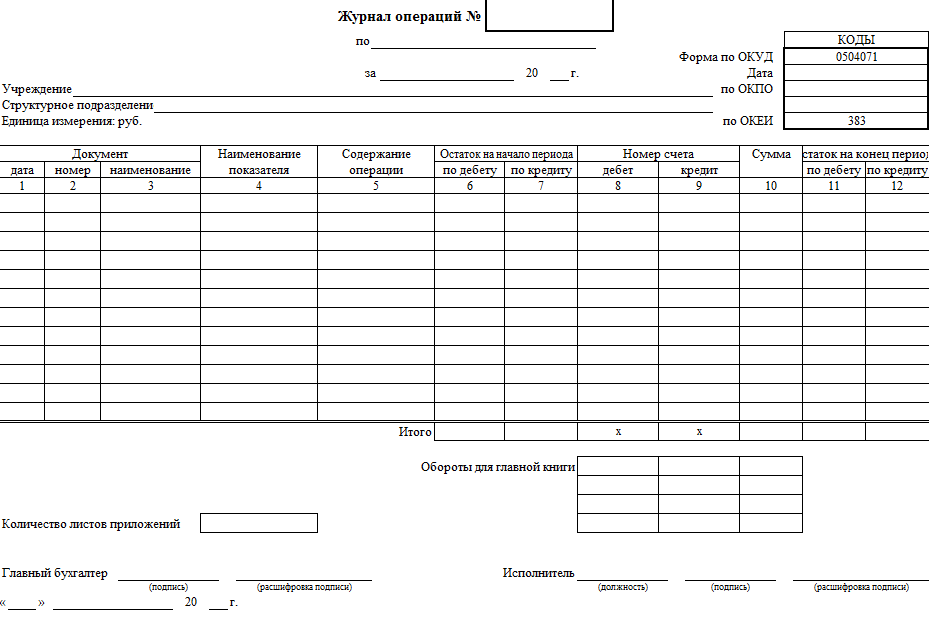 - Открываются отчёты раздела Регламентированные регистры учёта. Необходимо выбрать ссылку Журнал операций (ф. 0504071). Отчёт предназначен для получения журнала операций по унифицированной форме № 0504071 (рис. 2).
