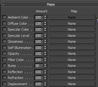 Перейдя во вкладку Maps, вы увидите данный список. None означает что никакой текстурной карты пока нет. Кликнув напротив Diffuse Color на None