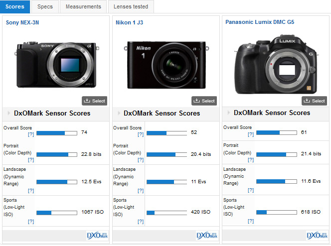 Он оценивает датчики камеры по глубине цвета (DXO Portrait), динамическому диапазону (DXO Landscape) и чувствительности при слабом освещении (DXO Sports), а также дает им общую оценку. Датчики Sony NEX-3 и Sony NEX-5N были протестированы DxO, и результаты показывают, что NEX-5N имеет лучший общий балл 77, что на 9 баллов выше по сравнению с 68 баллами NEX-3.