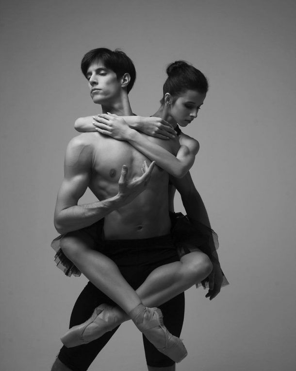 Один человек стоит и балансирует на одной ноге, затем обхватывает противоположной ногой талию партнера для поддержки.